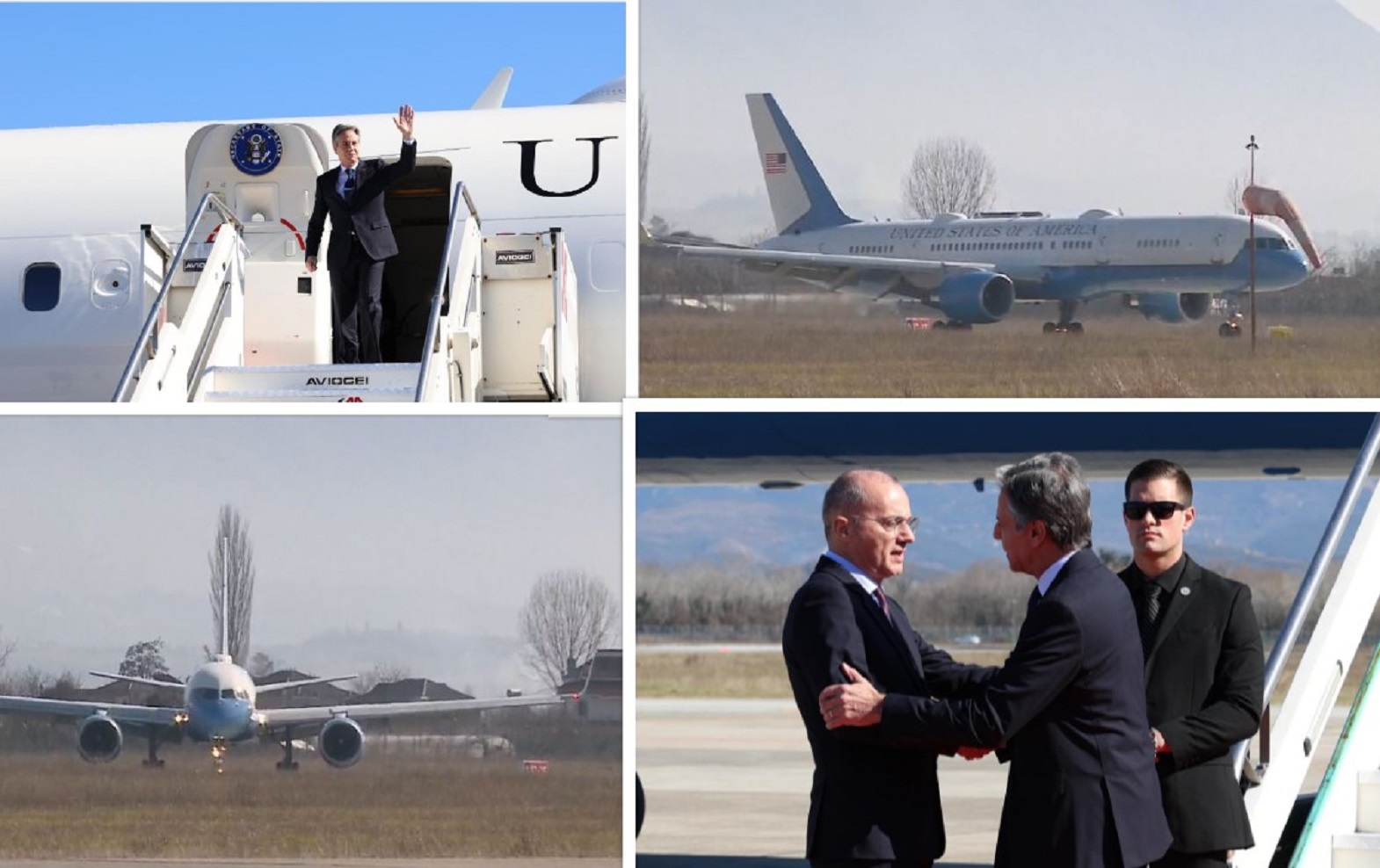 Ora 11:12, avioni i Sekretarit amerikan të Shtetit zbret në pistën e aeroportit ‘Nënë Tereza’ në vizitën e tij të parë në Tiranë.