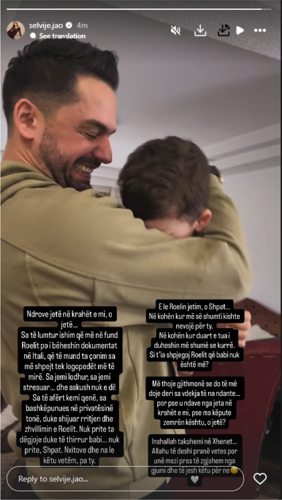 E prekur thellë nga humbja, ajo thekson se Shpati nuk arriti ta dëgjonte kurrë djalin ta thërriste “babi”, duke shprehur dhimbjen e madhe që ai u largua në një kohë kur Roeli kishte më së shumti nevojë për të.