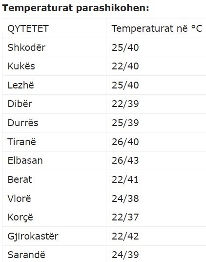 Moti i kthjellët dhe temperaturat shumë të larta do të mbizotërojnë në të gjithë territorin, por qarku i Beratit, Elbasanit dhe Gjirokastrës do të regjistrojë temperaturat më të larta, mbi 40 gradë celcius.