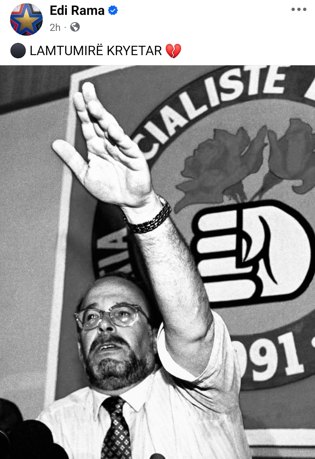 “LAMTUMIRË KRYETAR“, shkruan Edi Rama teksa ndan fotografinë e mëposhtme të Fatos Nanos, si dhe dy emoji (figura) një të zezë dhe një zemër të thyer.