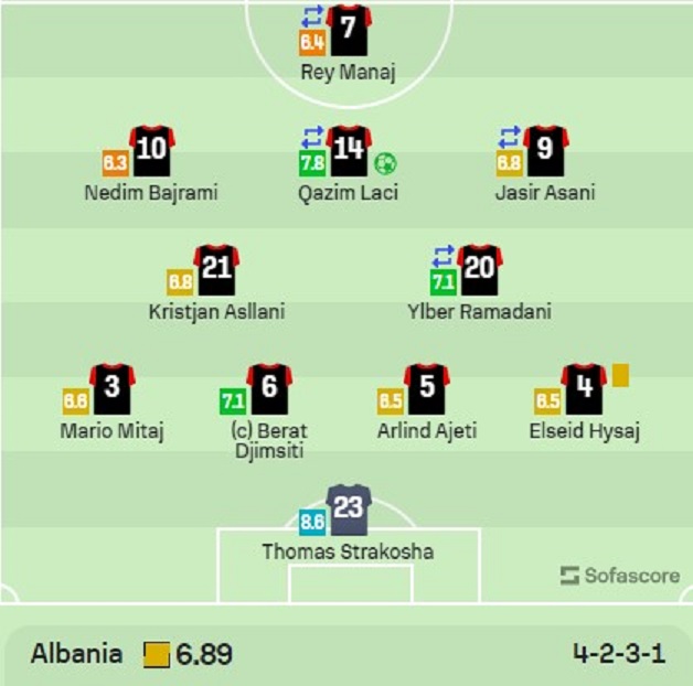 Sa i takon vlerësimit nga “SofaScore”, Elseid Hysaj “ngelet” në klasë dhe vlerësohet me notën më të ulët (6.5) pasi shihet si fajtor në dy golat që pësoi Shqipëria. Ndërkohë Qazim Laçi ka bërë një performancë të shkëlqyer duke marrë notën e lartë (8.3).