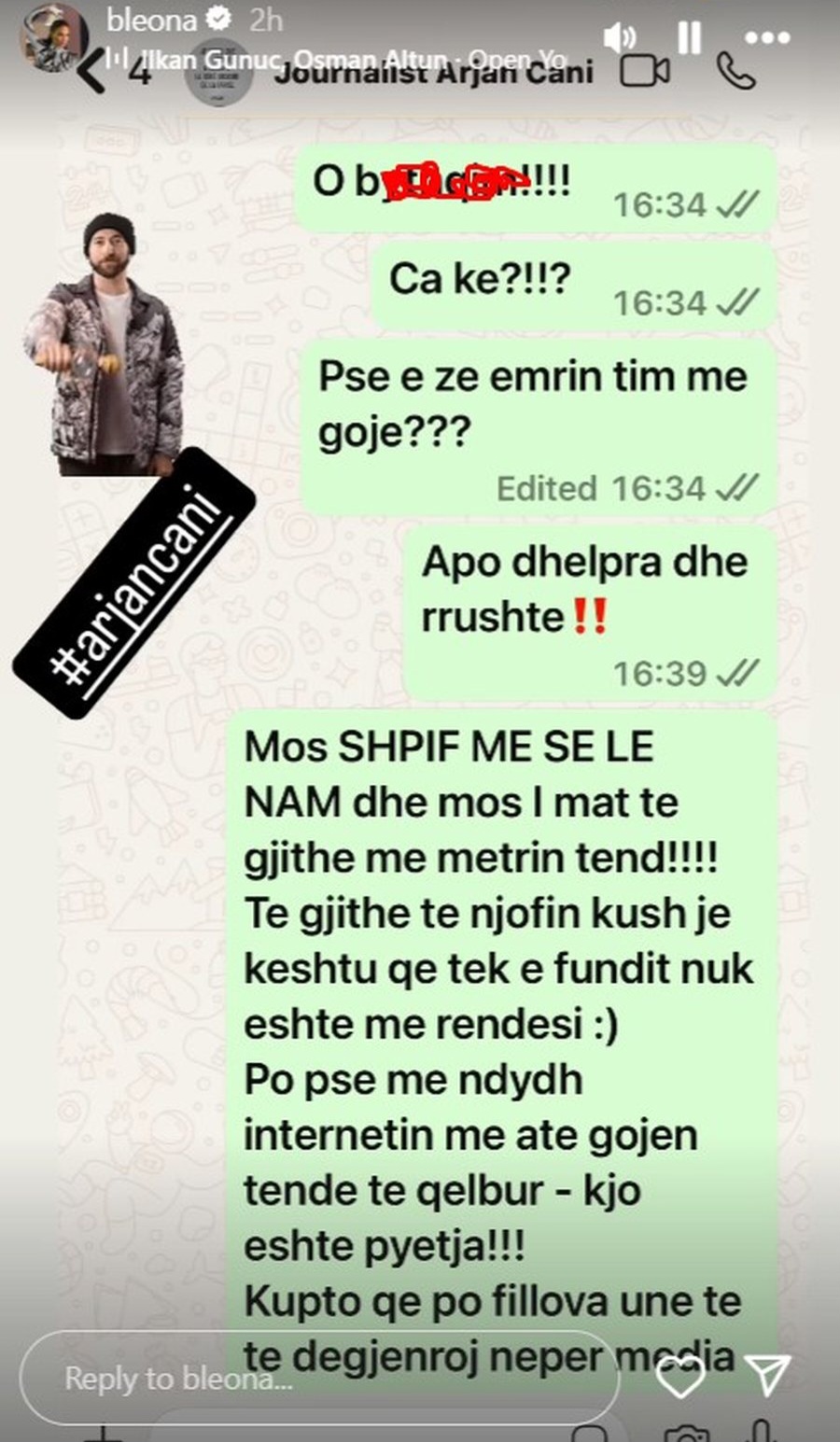 E pasditen e sotme Bleona ka vendosur të bëjë për “ujë të ftohtë” Çanin. Ajo ka publikuar mesazhet që i ka dërguar atij, si dhe nuk na nguruar t’i përgjigjet dhe përmes një video të cilën e ka publikuar në “Instagram”.