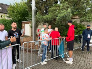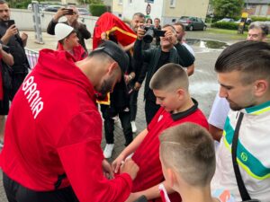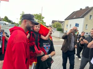 Sot ishte Armando Broja që ka lumturuar të pranishmit jashtë kampit të “Kaiserau” duke dhuruar autografe dhe fotografi me tifozët e Shqipërisë. SHIKONI FOTO GALERINE: