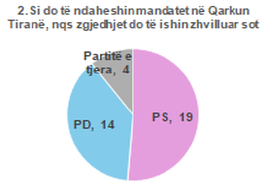Përqindjet e mësipërme përkthehen me formulën D’Hont në mandate si vijon: PS 19 mandate, PD 14 mandate, dhe partitë e tjera 4 mandate (shihni Grafikun 2).