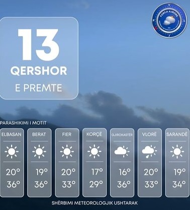Temperaturat e ajrit do të ulen lehtë në mëngjes, por mbeten konstante në mesditë duke u luhatur nga 13°C vlera më e ulët deri në 36°C vlera më e lartë në rang territori.