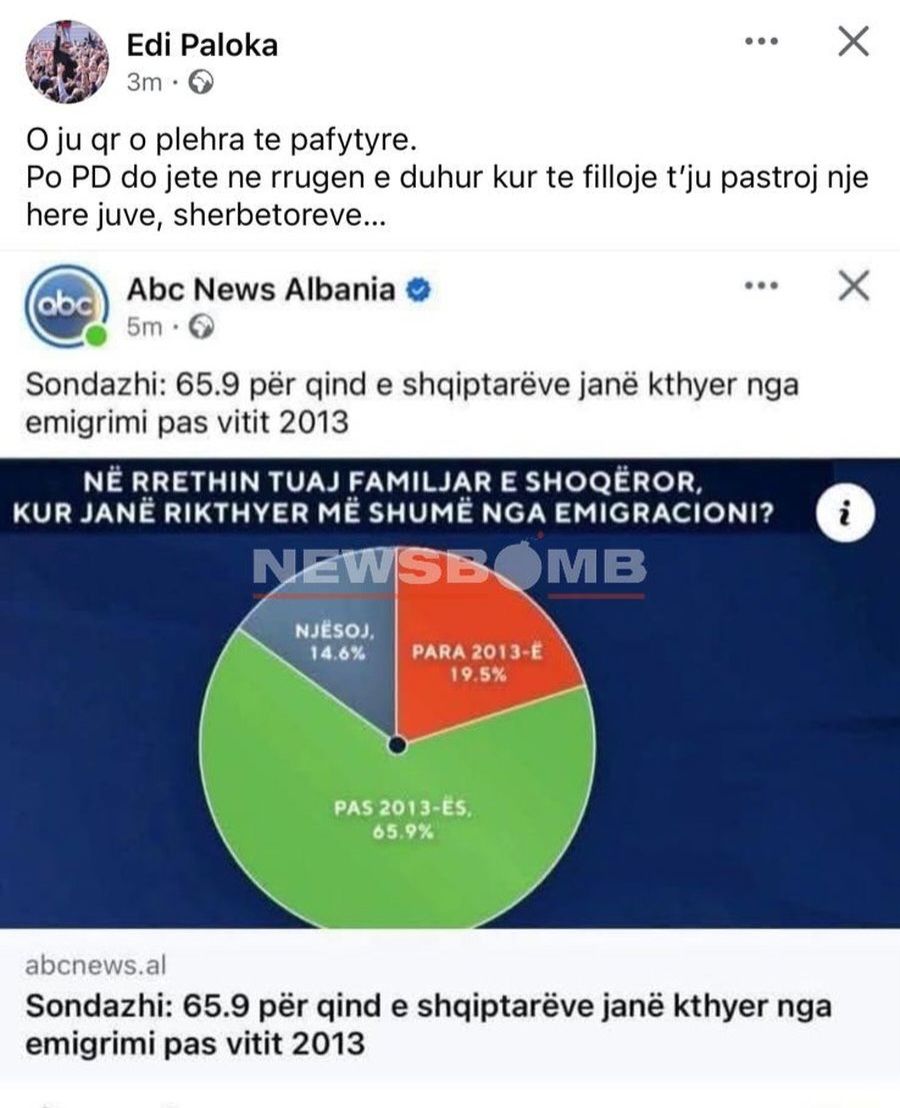 Publikimi i sondazhit të “ABC News” që tregon se 69.5% e shqiptarëve janë rikthyer në Shqipëri pas 2013, i ka sosur durimin demokratit Edi Paloka.