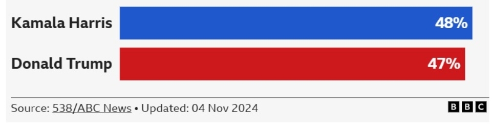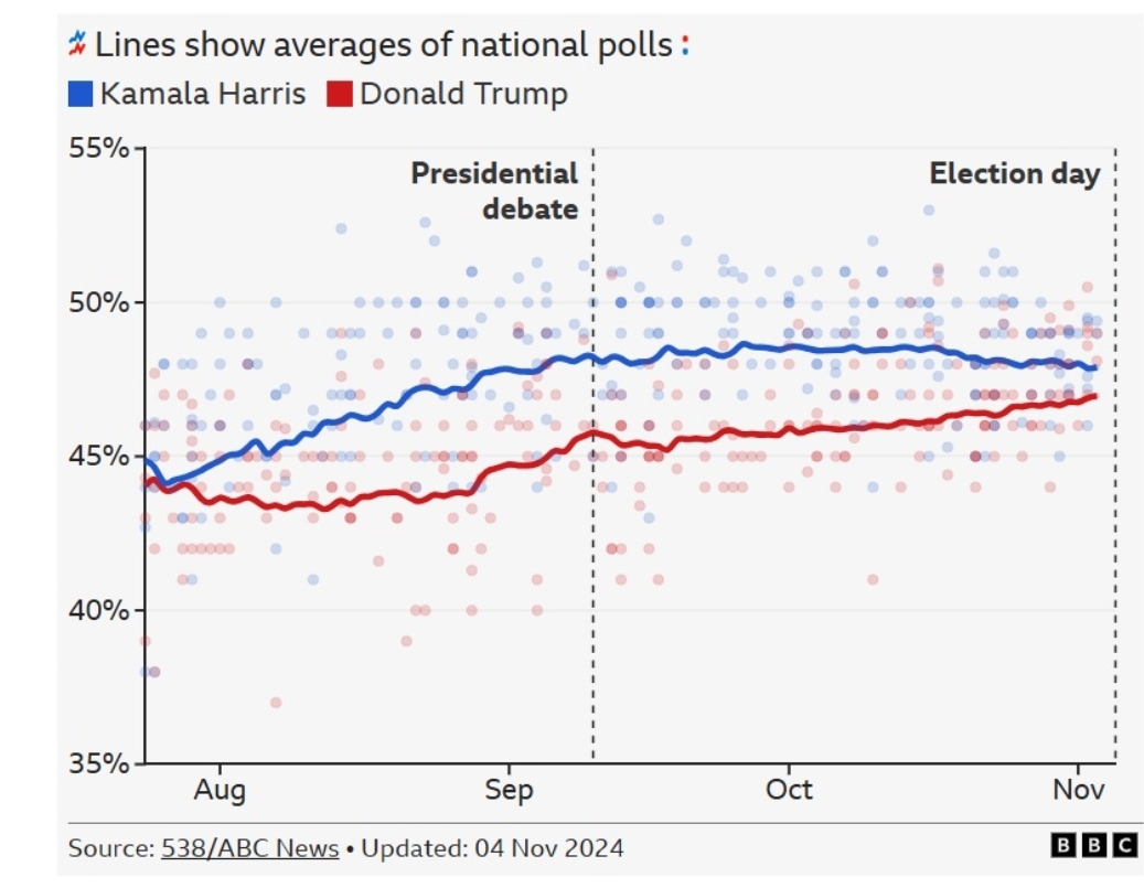 Sondazhet ishin relativisht të qëndrueshme edhe në shtator dhe në fillim të tetorit, por ato janë shtrënguar në dy javët e fundit, siç tregohet në grafikun e mëposhtëm, me linjat e trendit që tregojnë mesataret dhe pikat për rezultatet individuale të sondazheve për secilin kandidat. Momentalisht Harris është në avantazh shumë të lehtë përballë Trumpit.