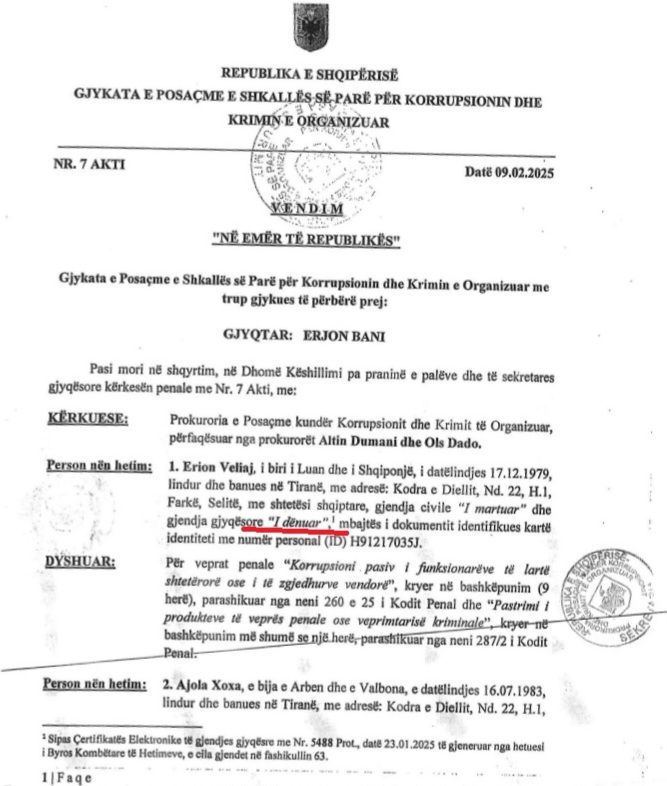 Veliaj denoncoi atë që e quajti një “gabim trashanik” në dosjen e tij hetimore, ku prokurori i çështjes, Ols Dado kishte shënuar se ai ishte i dënuar, sipas një dokumenti të Byrosë Kombëtare të Hetimeve. Veliaj theksoi se kjo është një shpifje, pasi dëshmia e tij e penalitetit është e pastër dhe se si kryebashkiak ka plotësuar të gjitha formularët e dekriminalizimit.