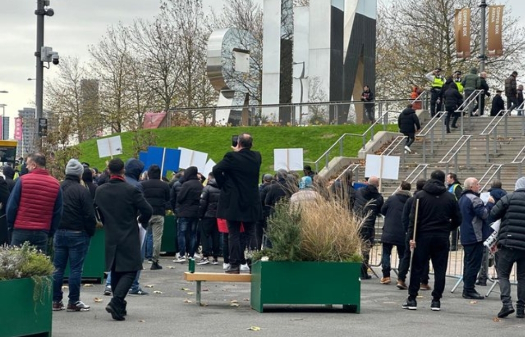 Protestuesit janë një numër i vogël, që nuk shkon as 20 vetë, ndërkohë salla me një kapacitet prej 4.500 vendesh po mbushet plot duke mirëpritur kreun e qeverisë.